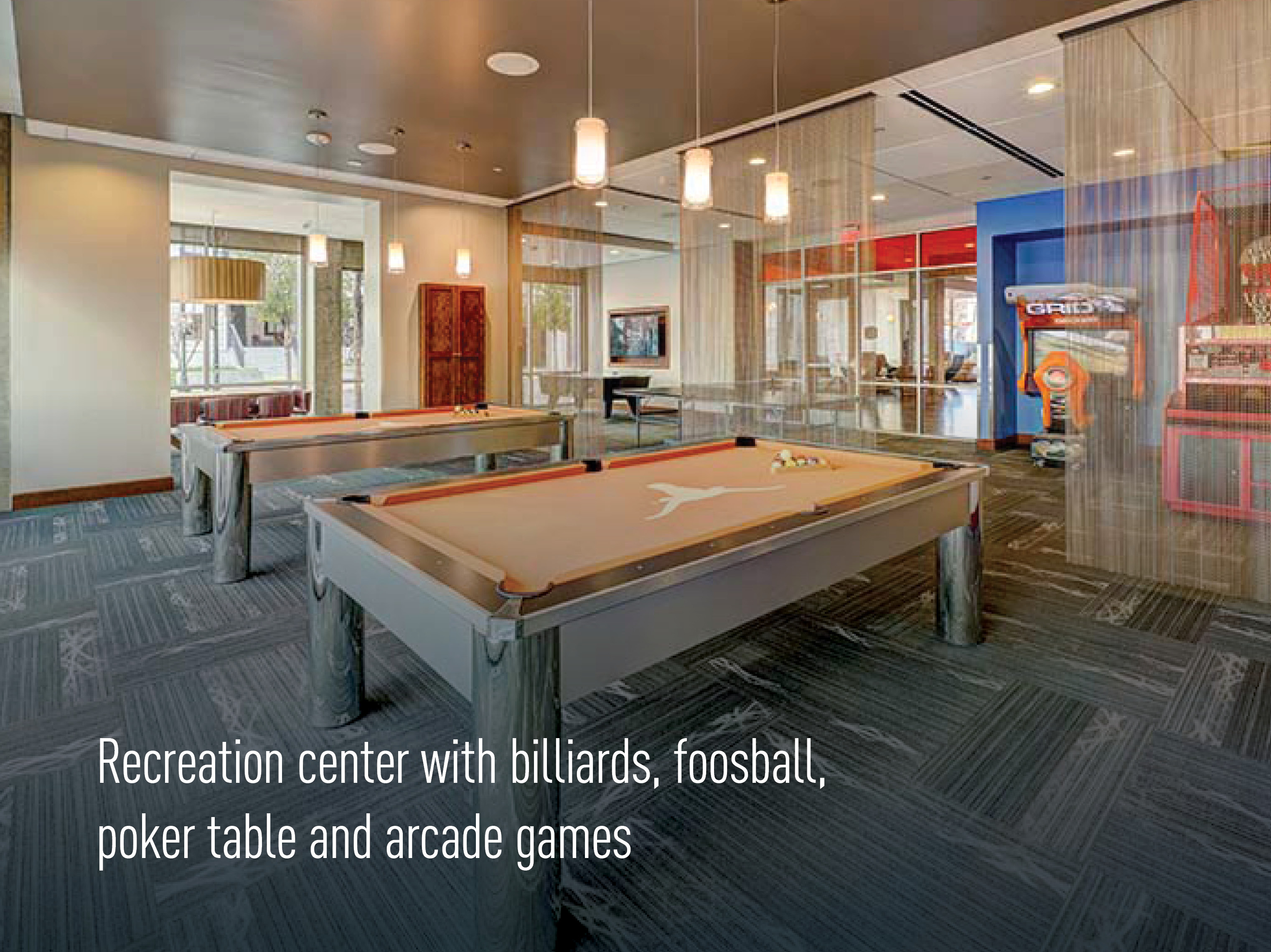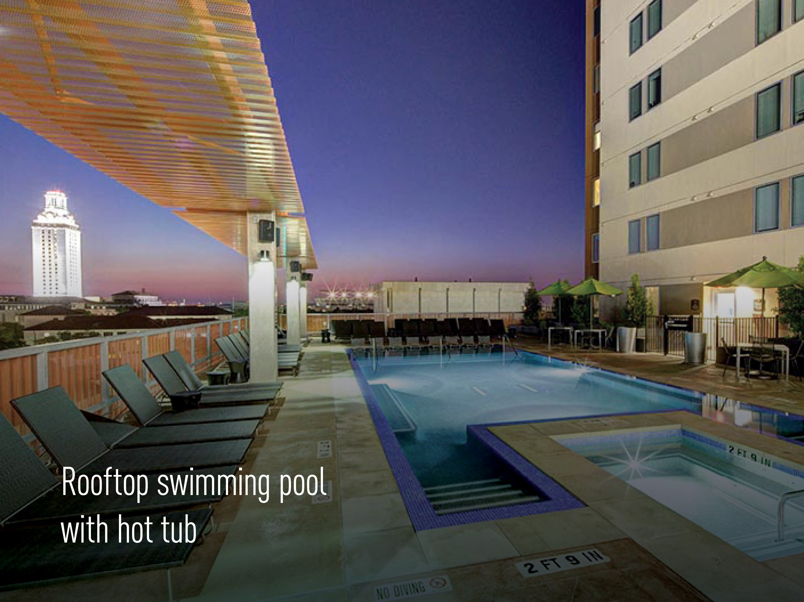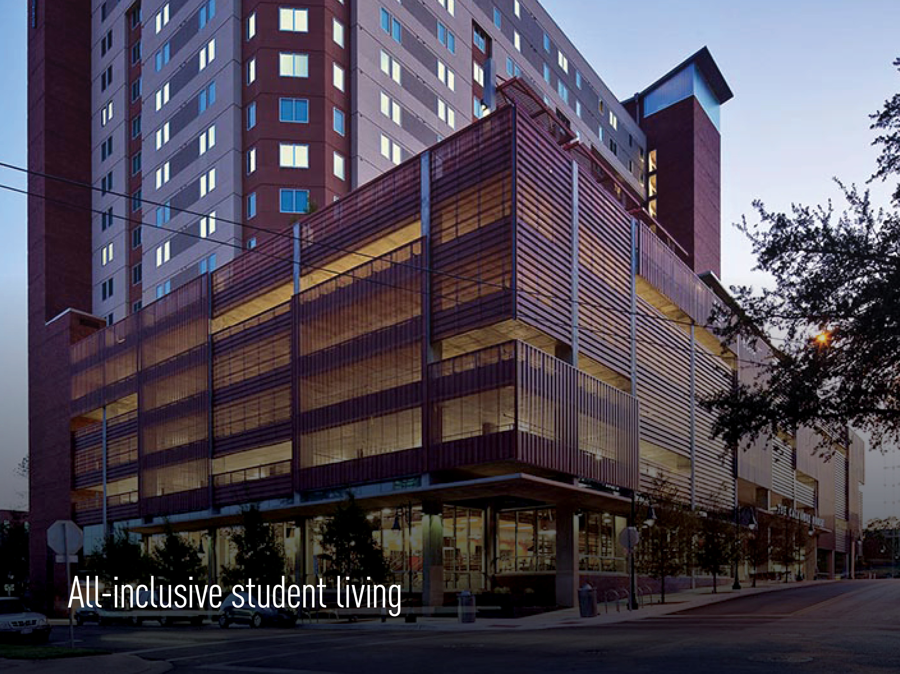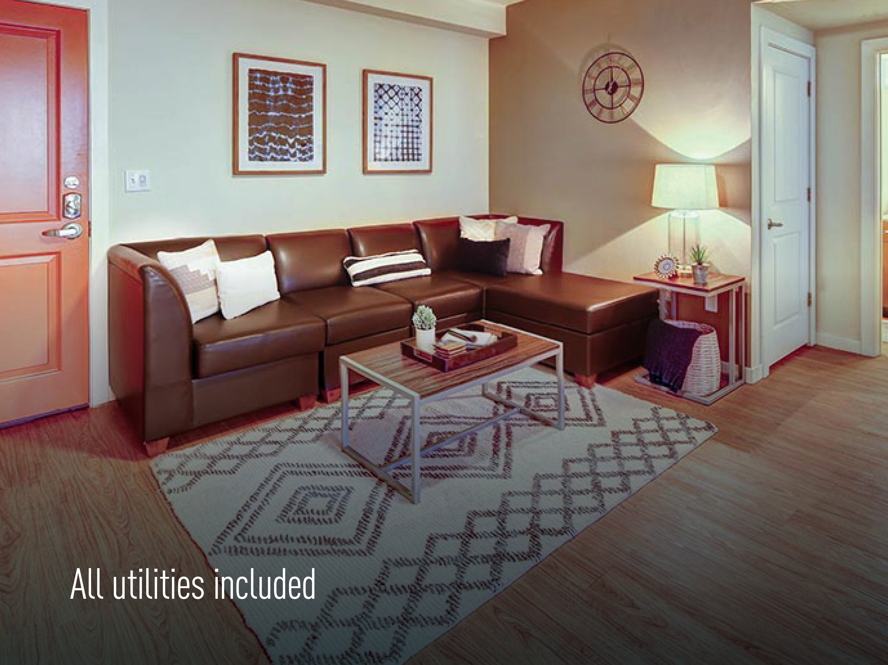 Your rental installments include an academic lease in a fully furnished unit, your meal plan in the full-service dining hall, all utilities (electricity, water, and internet) and access to all community amenities. Garage parking is available for an additional fee.