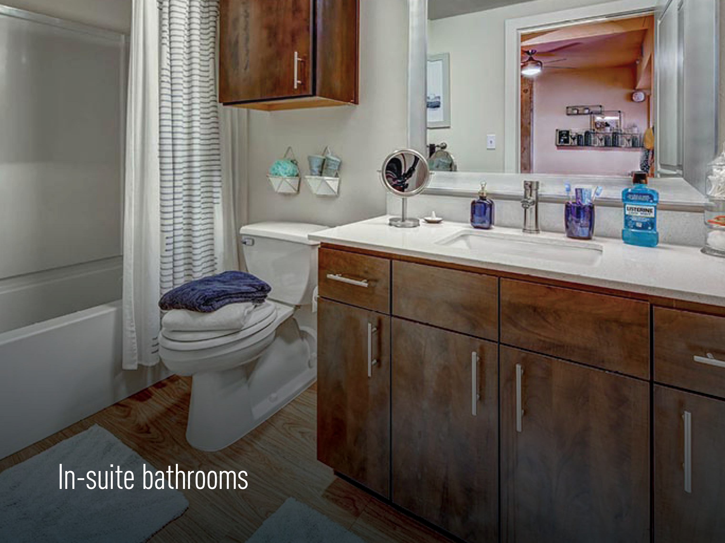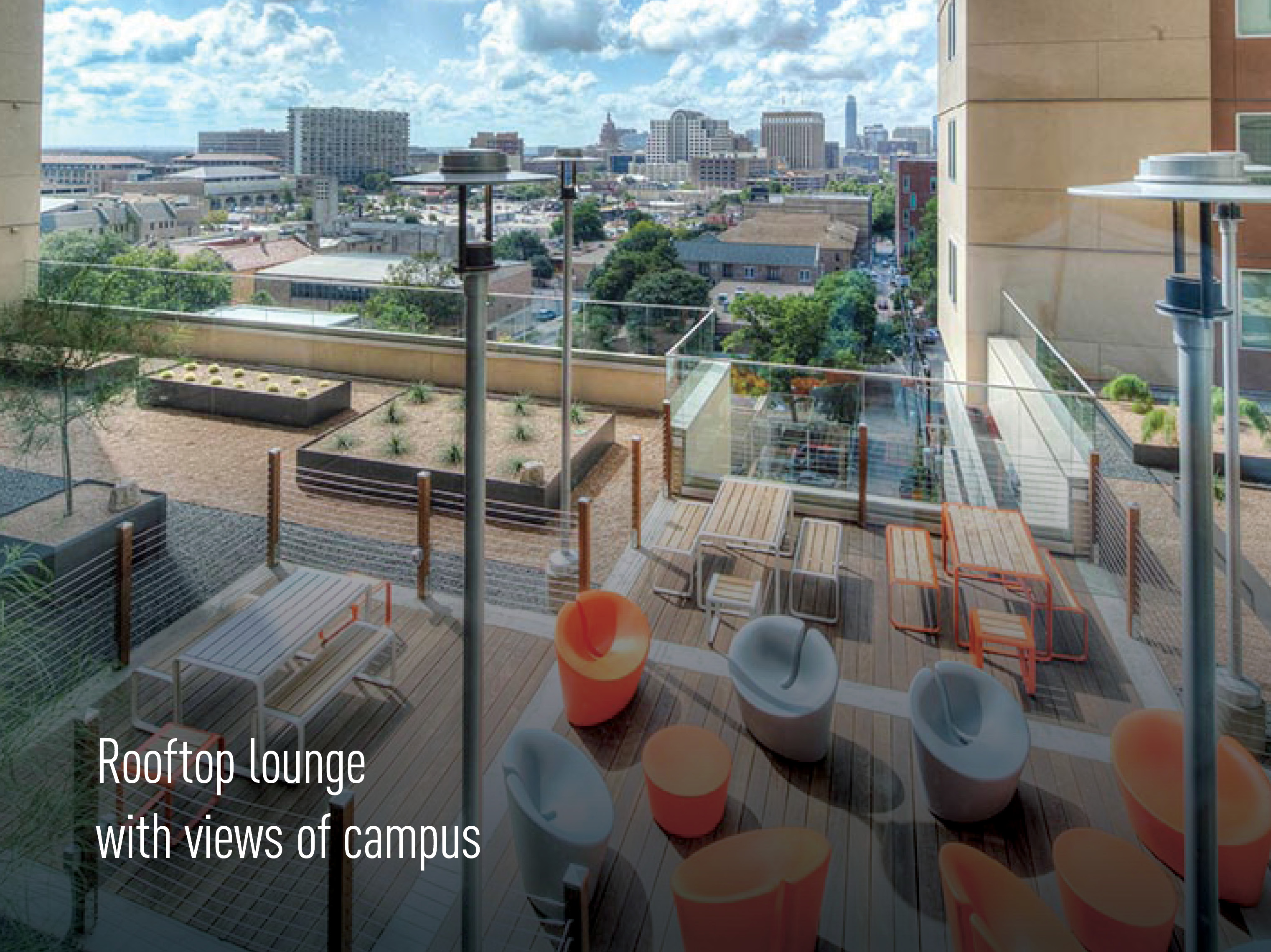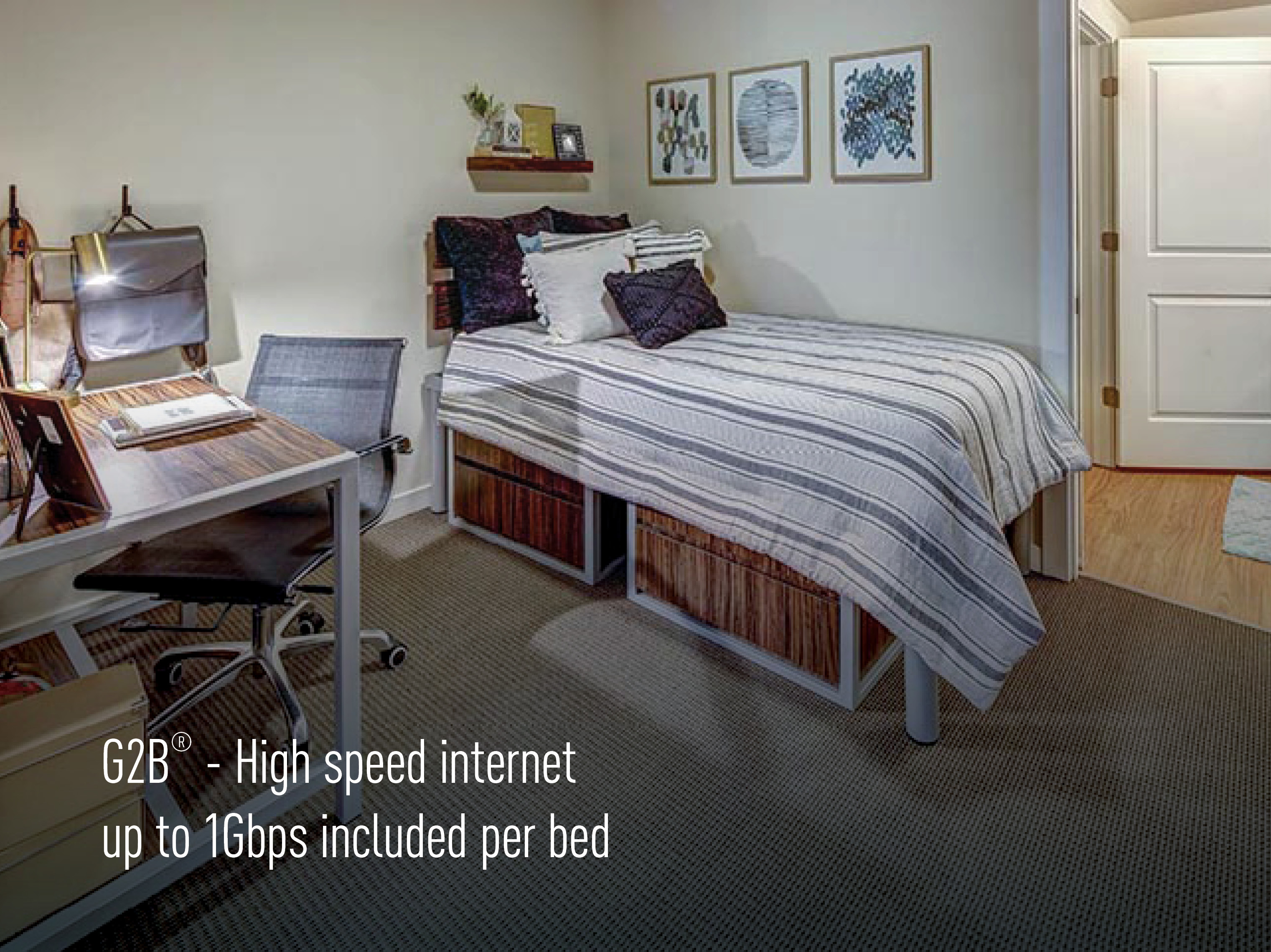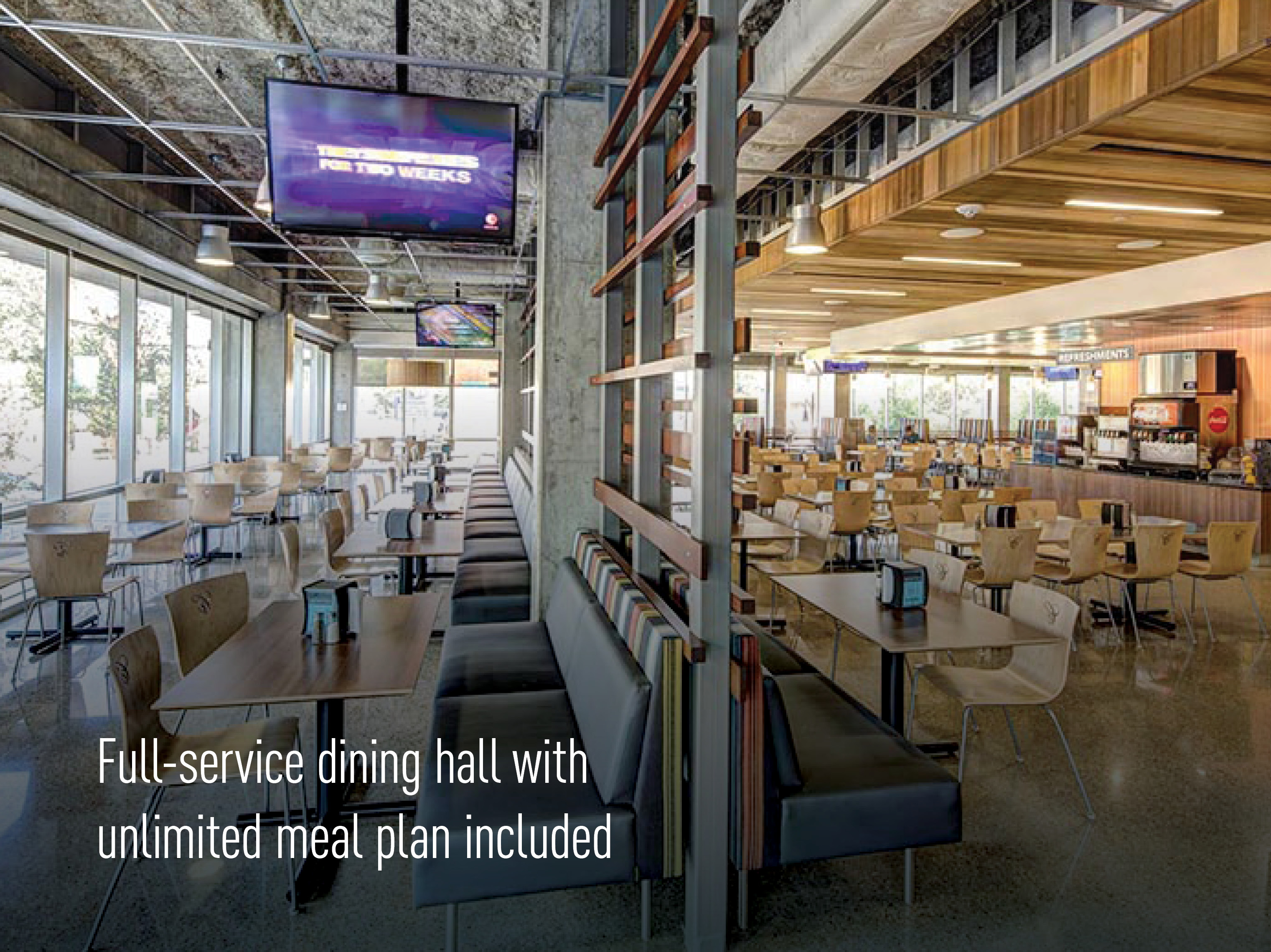With a full-service dining hall, state-of-the-art amenities, professional, on-site management and maintenance, and biweekly housekeeping services, you can rest easy knowing your student is maximizing their college experience by living at a community with so many included benefits.